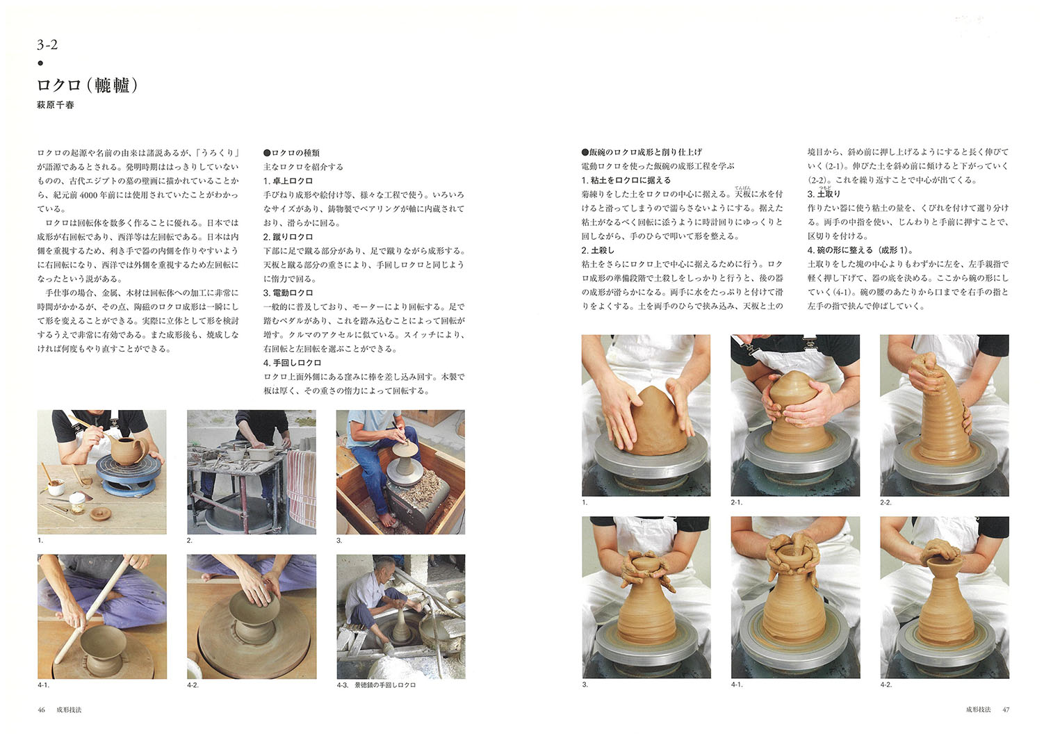 3-1 手びねり=西川聡/ 3-2 ロクロ(轆轤)=萩原千春/作品紹介・萩原千春/ 3-3 板づくり=西川聡/ 3-4 型押し=磯谷慶子/ 3-5 鋳込み成形=磯 谷慶子